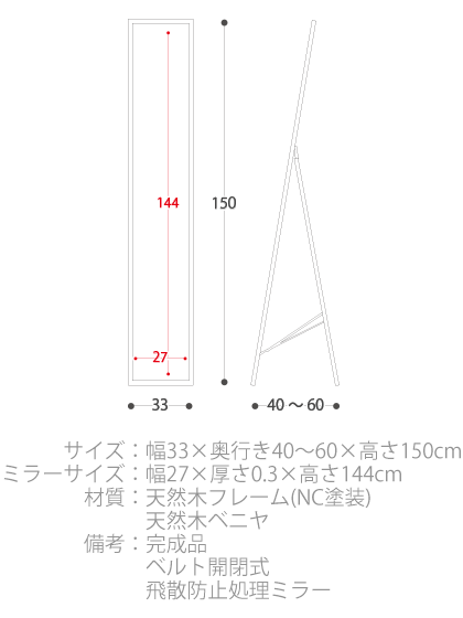 サイズ: 幅33×奥行き40〜60×高さ150cm ミラーサイズ: 幅27×厚さ0.3×高さ144cm 材質: 天然木フレーム(NC塗装)、天然木ベニヤ 備考: 完成品、ベルト開閉式、飛散防止処理ミラー